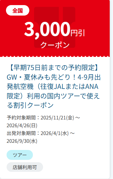 その場合は楽天トラベルJTBツアー向けの割引クーポンを発行していることもあります。